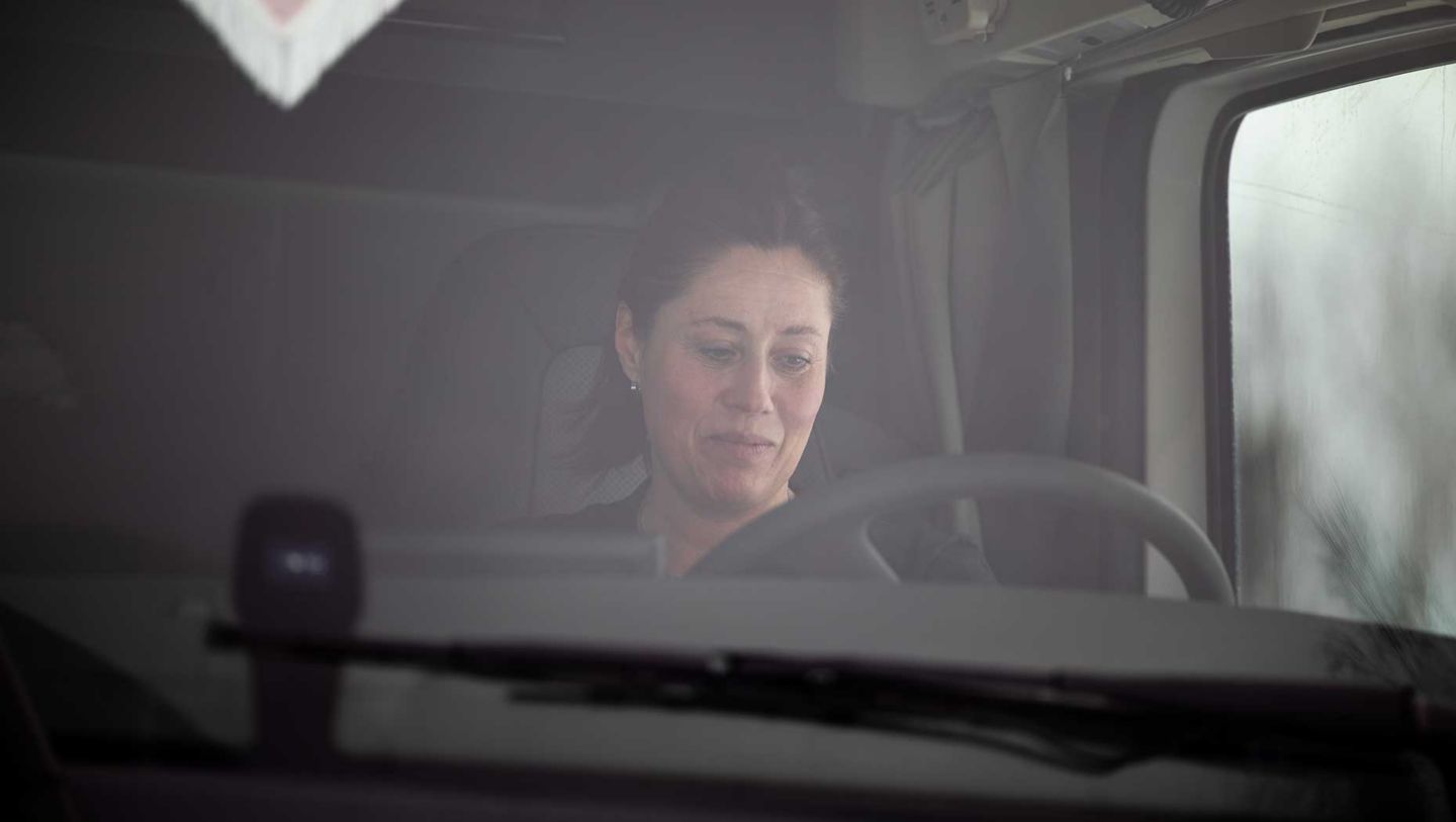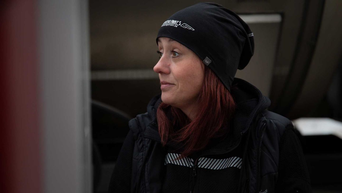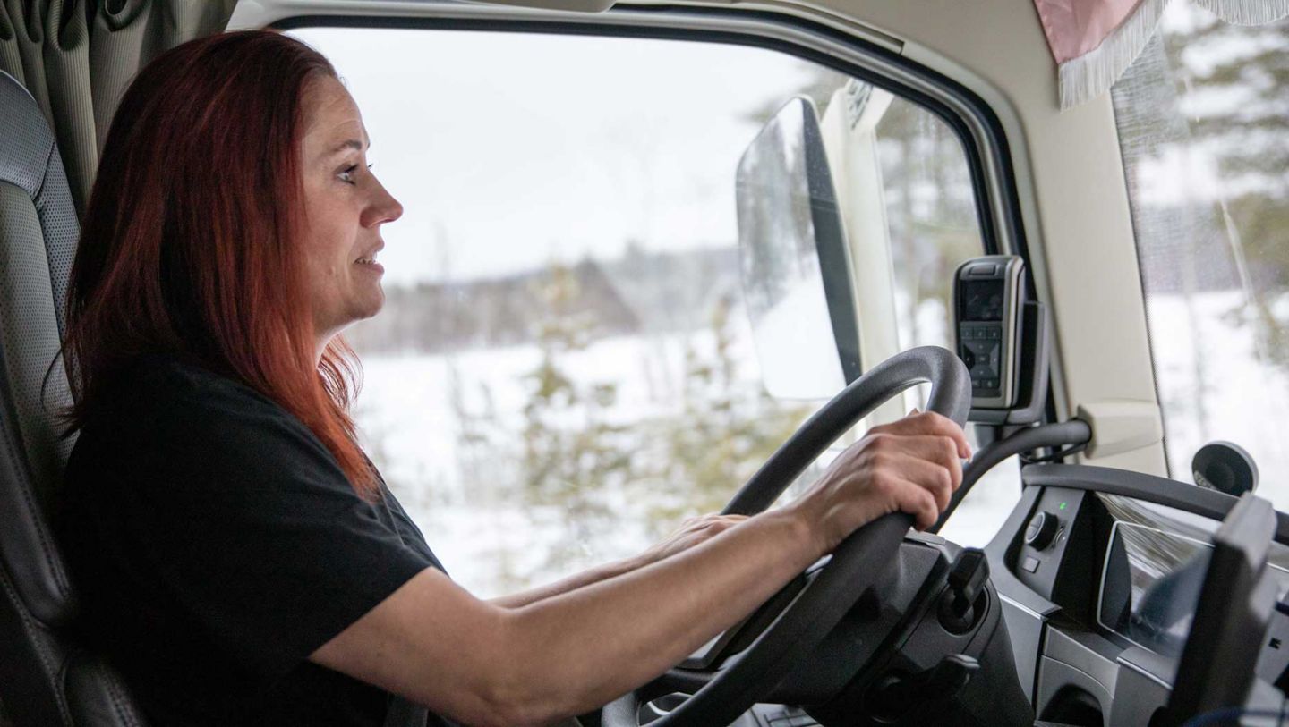 Magdalena sadlade om från kontorist till lastbilschaufför för knappt tre år sedan och har redan hunnit bli en skicklig och bränsleeffektiv förare. Fastän sträckorna är kuperade med mycket snö och ibland oplogade småvägar ligger hennes 32-tons tridembil på en snittförbrukning runt 2,6 liter per mil.